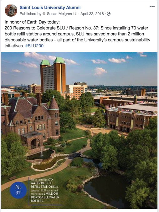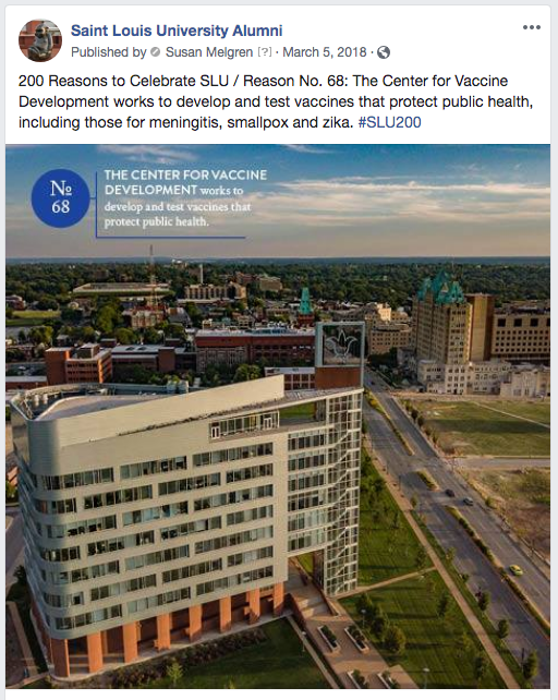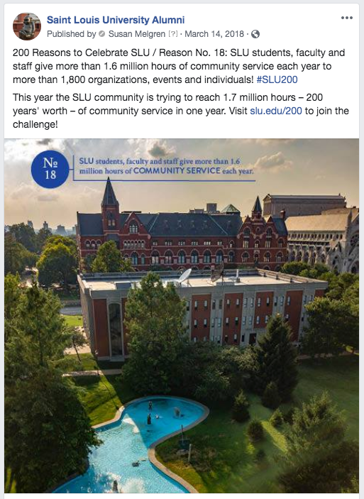 Saint Louis University celebrated its bicentennial in 2018. I created the 200 Years, 200 Reasons to Celebrate SLU campaign as a way of applying this milestone to fundraising. Beginning in late 2017, this messaging was used for Annual Giving's major direct mail pieces. Print pieces and follow-up emails featured beautiful aerial photography of SLU's campus and highlighted several (out of 200) of SLU's accomplishments from throughout its history. Social media posts were created from the same art and list of accomplishments, and social ads encouraged alumni to donate. A space on the online gift form allowed donors to contribute their own reason for celebrating SLU with a donation.